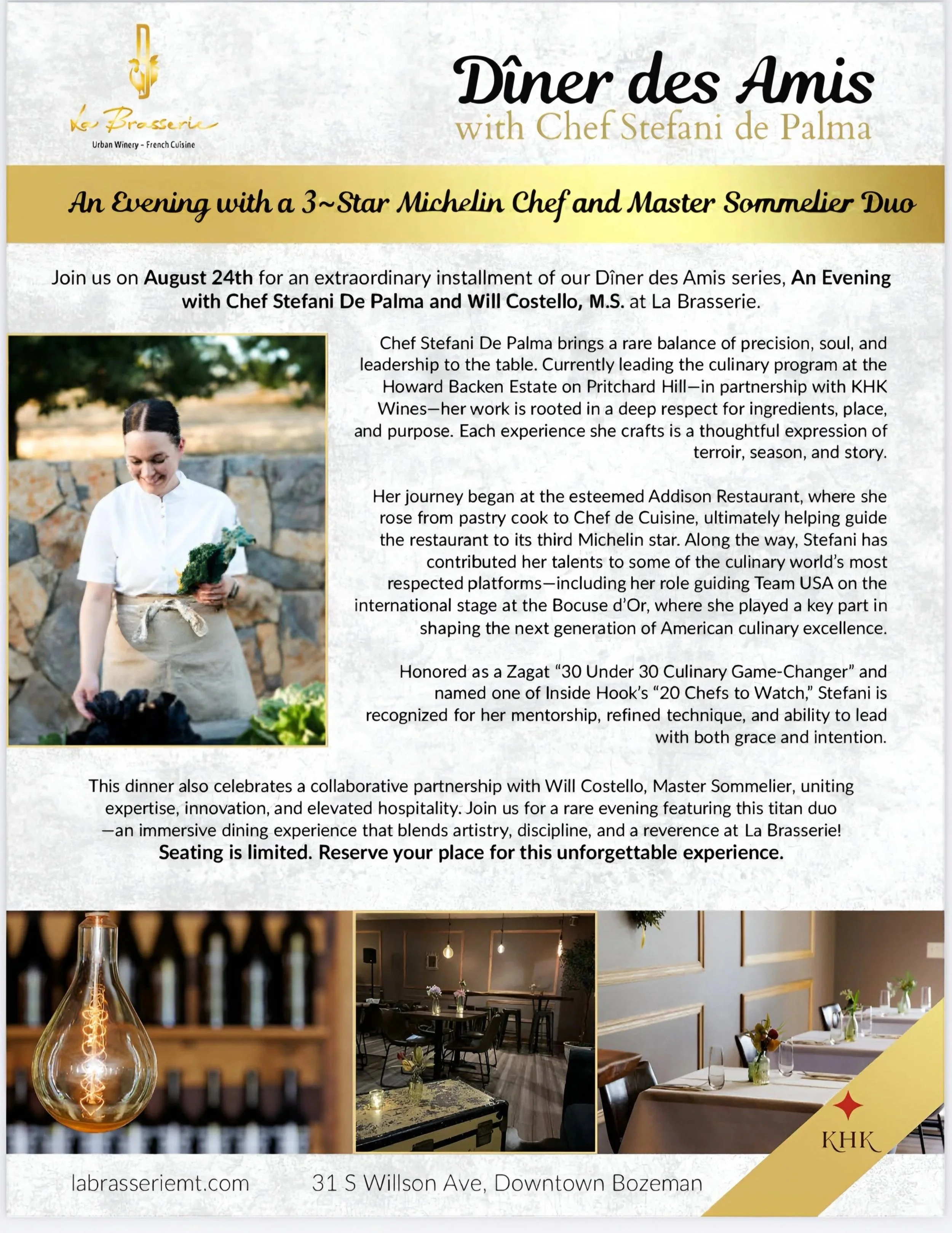 Back to All Events Diner des Amis Sunday, August 24, 2025 6:00 PM 8:00 PM La Brasserie 31 South Willson Avenue Bozeman, MT, 59715 United States (map) Google Calendar ICS Purchase Reservation Here